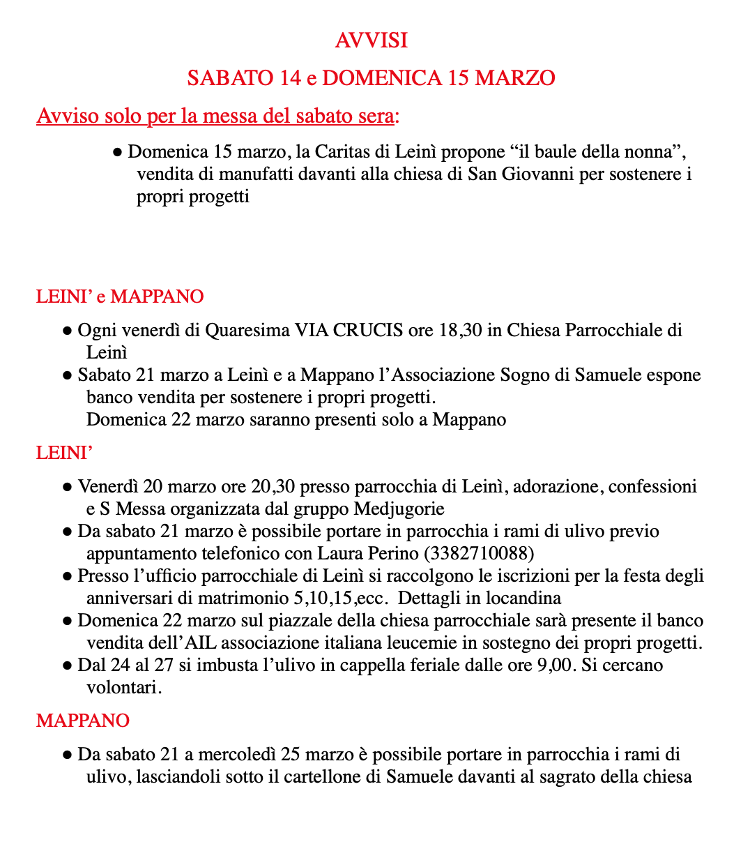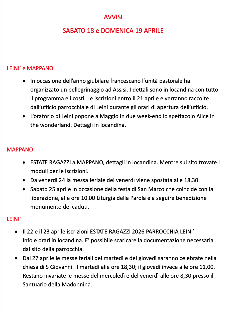 Chi non potesse recarsi di persona all’ufficio parrocchiale può inviare tutta la documentazione richiesta per email all’indirizzo parr.leini@diocesi.to.it (sempre entro il 21 aprile 2026).