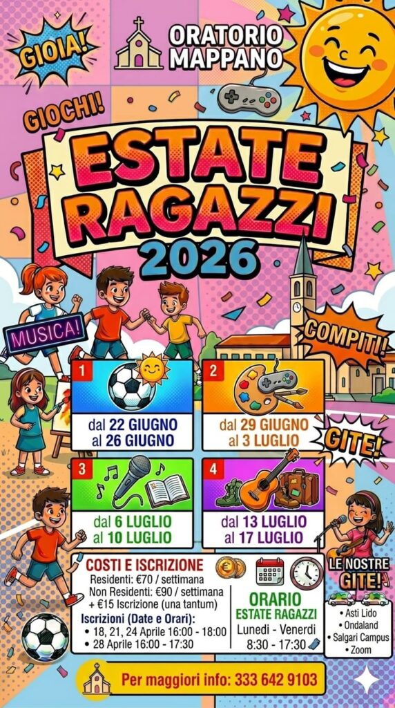 Per iscriversi occorre scaricare il modulo dal sito (lo trovate qui sotto), effettuare il bonifico dell’acconto pari a euro 250,00 e consegnare in ufficio parrocchiale di Leinì (ORARIO: dal martedì al giovedì 9-11,30; venerdì 16-18): scheda compilata in tutti i campi, copia del bonifico effettuato e fotocopia della carta di identità fronte e retro entro il 21 aprile 2026.